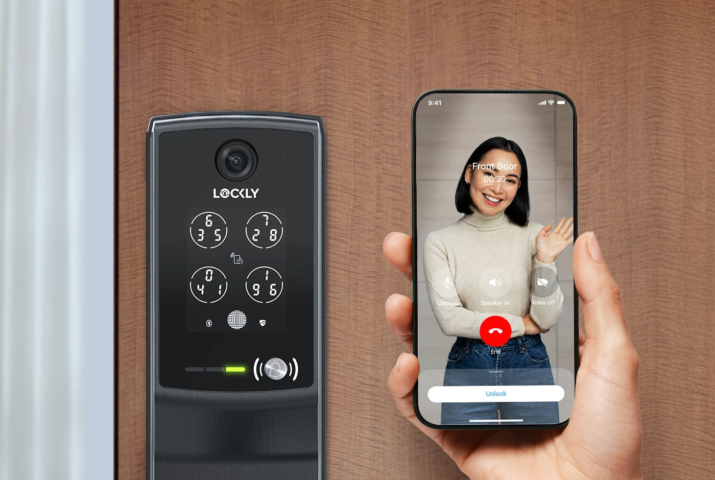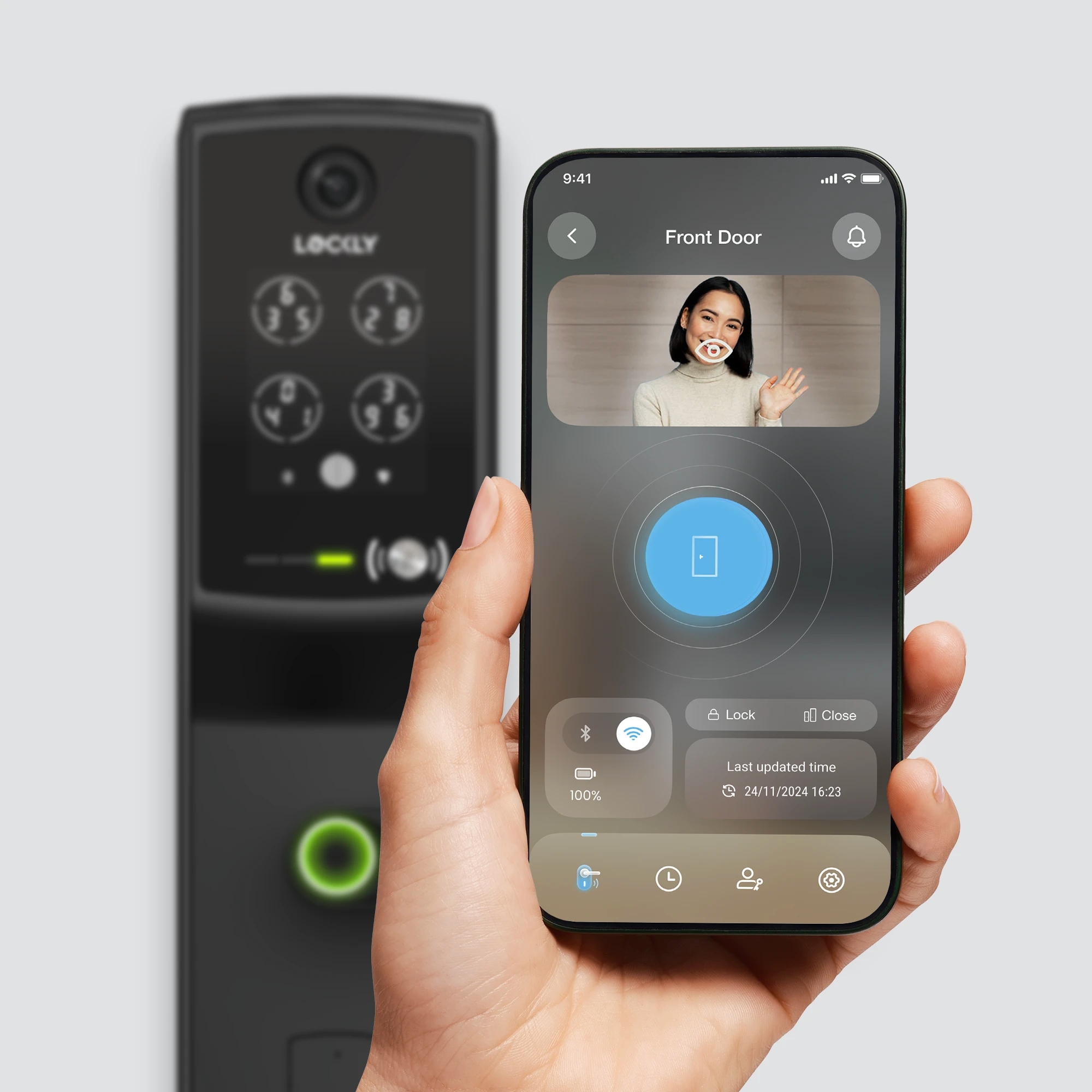 配備 Full HD 全高清廣角鏡頭及智慧門鈴,當有訪客按下門鈴時,用戶除可透過視像功能確認其身份,亦可與他對話,並透過Lockly App進行遙距解鎖,不受地域所限。