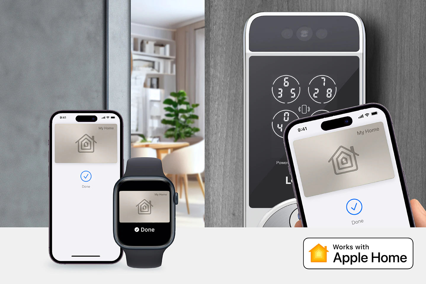 只需以 iPhone 或 Apple Watch 輕拍 Lockly Visage 即可快速解鎖。你更可使用 Apple Home 應用程式以 Siri 解鎖或增加自動化的設定。